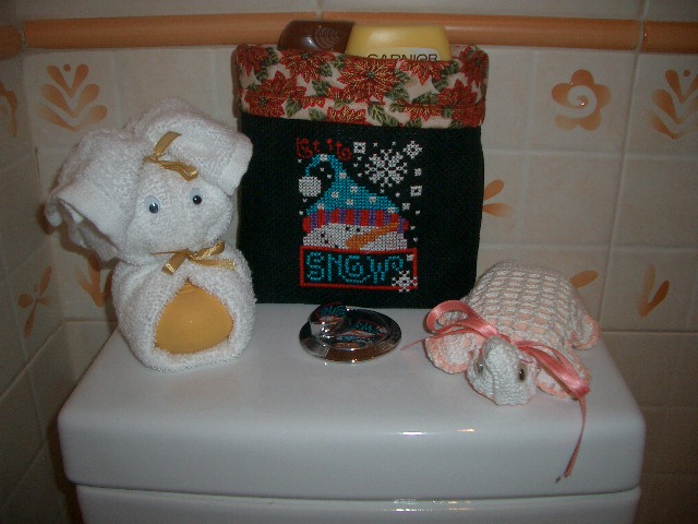 Este ano já fiz algumas coisitas, vou começar por mostrar uma que acabei esta tarde, comecei por um bordado simples de um boneco de neve em quadrilê preto, com ele fiz um saquinho forrado com um tecido também natalicio, para já foi direitinho para a minha casa de banho para guardar os meus shampoos, mesmo ao lado do coelhinho que me ofereceu a Ana e da minha tartaruguinha em crochê feita há muito por mim. Daqui a uns dias mostro mais coisitas, estou a bordar uma toalha e tenho mais um derretido prontinho a mostrar.
